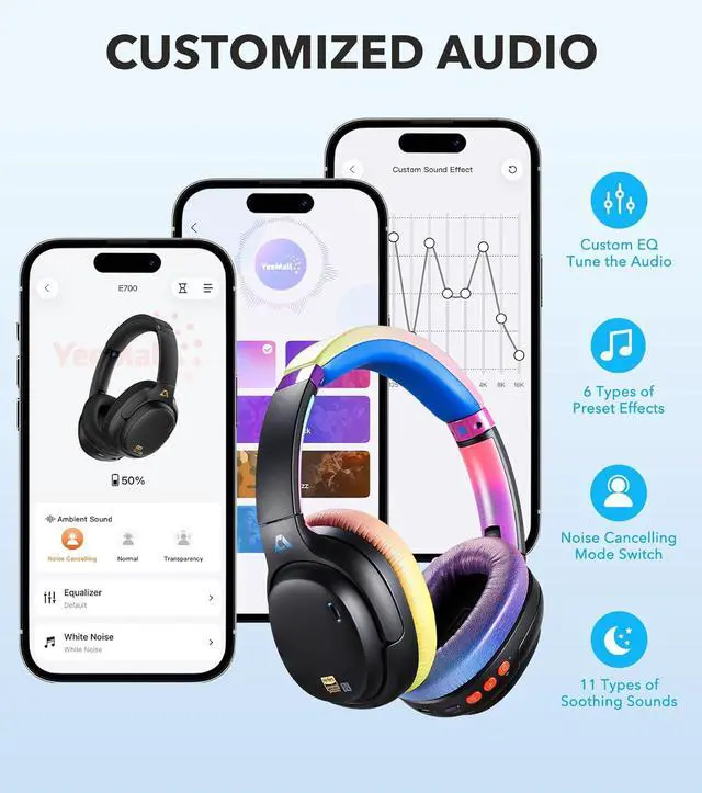 CUSTOMIZE YOUR SOUND VIA APPPersonalize your sound with the 1Mii E700 over-ear Bluetooth headphones. Choose from preset EQ profiles, fine-tune bass and treble to match your taste, or relax with soothing sleep sounds. Perfect for music, travel, or winding down after a long day