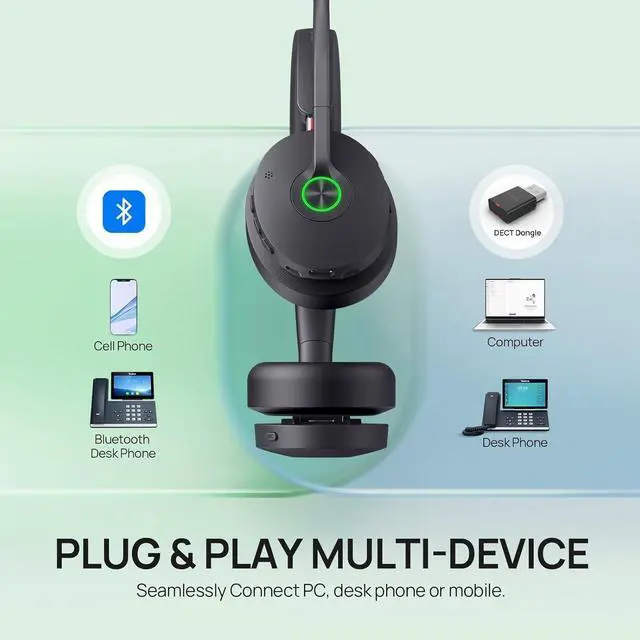 Dual-Mode Portable Headset: DECT+Bluetooth wireless headset with DECT dongle and carrying case for plug-and-play use across multi-devices(PC/phone/ mobile). Enjoy a 492 ft wireless range, partner for hybrid work, travel, or work-from-home