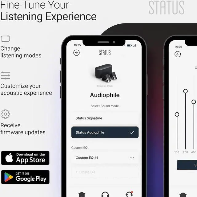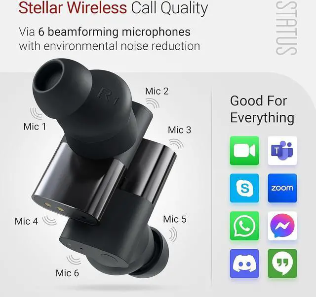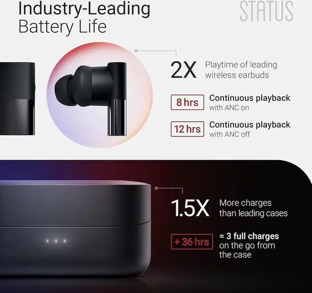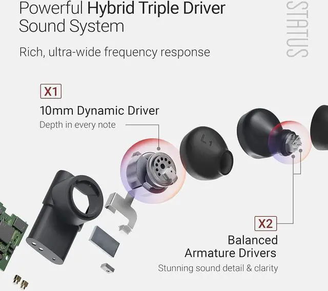 Advanced Triple Driver Technology: The Status Audio Between 3ANC earbuds are equipped with a sophisticated triple driver system, featuring one dynamic driver and two balanced armature drivers, delivering a powerful and immersive audio experience. This unique configuration ensures crisp highs, detailed mids, and deep bass, providing an unparalleled sound quality that will captivate any audiophile