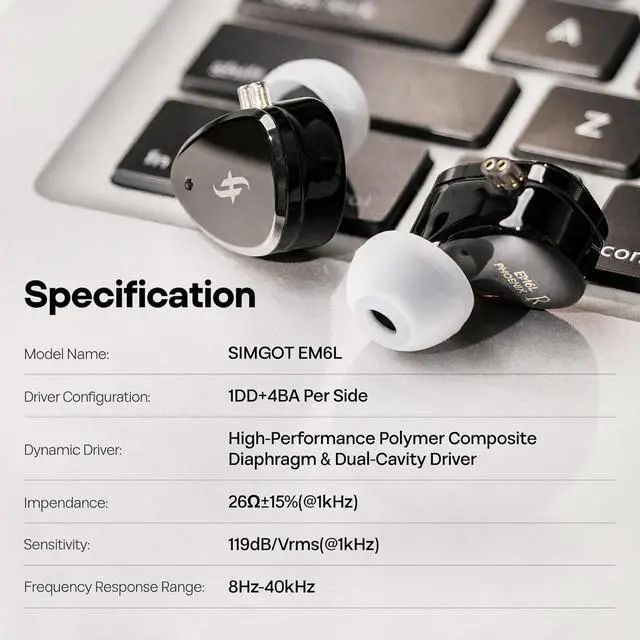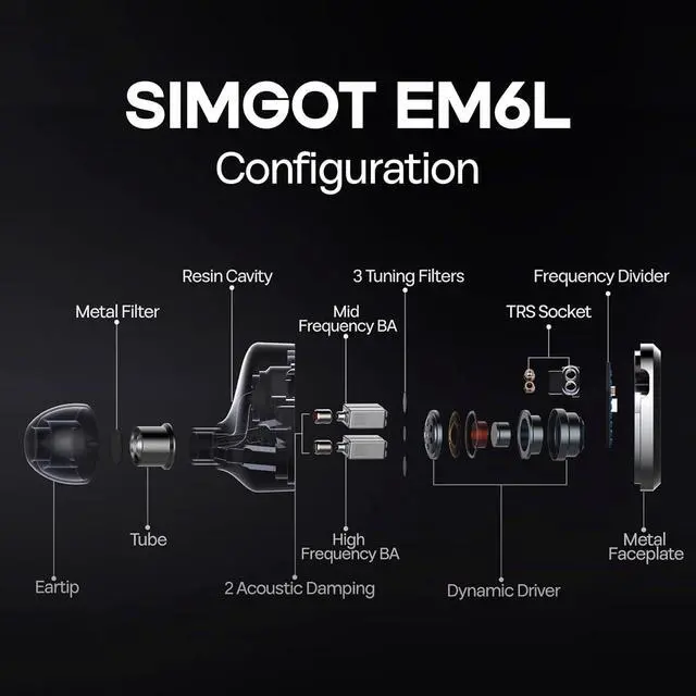 + Developed upon the legacy of its predecessor, the EM5, SIMGOT EM6L takes audio excellence to new heights. EM6L combines an 8mm custom-designed high-polymer diaphragm dual-cavity dynamic driver to handle the mesmerizing mid-to-low frequencies. Alongside, two sets of balanced armature drivers take charge of the mid-to-high and high frequencies. With meticulously set crossover points and precise tuning techniques, we not only achieve seamless frequency response and phase coherence but also achieve a harmonious blending of tones.