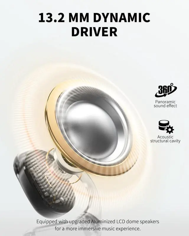 Immersive Premium Sound and Clear CallsThese wireless bone conduction bluetooth headphones feature upgraded 13.2 mm Aluminized LCD dome speakers that provide crystal-clear HD stereo sound, high-quality call clarity, and smoother music playback. The powerful bass enhances the energy and intensity of your music, keeping you motivated and entertained during workouts