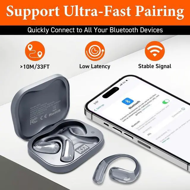 35 Hours Playtime: Our headphones charging case is equipped with an LED display to keep you informed of the remaining battery power and charging status of the open-ear earbuds. 35 hrs total battery life of charging case, for uninterrupted listening. The wireless headphones lightweight open design makes it convenient for you to carry without taking up any space
