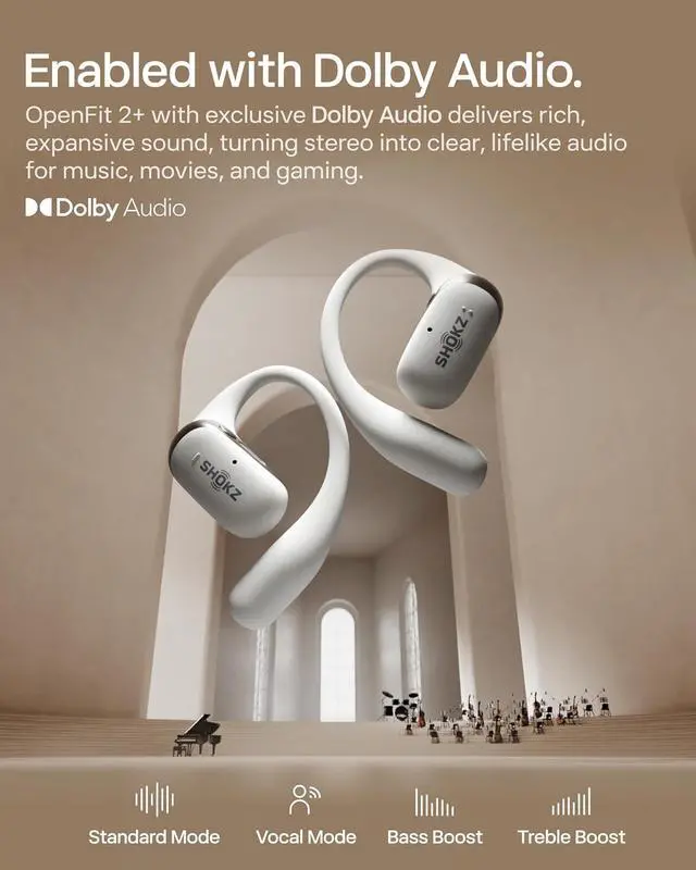 Detail-Rich Audio, Dolby Audio Optimised Powered by Shokz DualBoost, the OpenFit 2+ ensures bright highs and deep lows. A 17.3 mm low-frequency driver delivers thumping bass, while an independent tweeter brings out crisp highs and our AI algorithm OpenBass 2.0. Activate Dolby Audio for added clarity and dimension in the Shokz App.