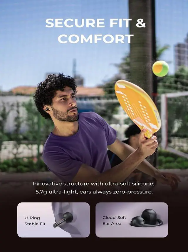 Lightweight & Comfortable, No Pressure FeelingHaowolf open ear earbuds are made of soft silicone, with each earbud weighing only 5.7 grams, ensuring all-day wear without pressure. The ergonomic ear hook design guarantees a secure fit, adapting to various ear shapes while maintaining long-lasting comfort. Whether running, cycling, or engaging in other activities, you can enjoy music freely without worrying about the bone conduction earbuds slipping off