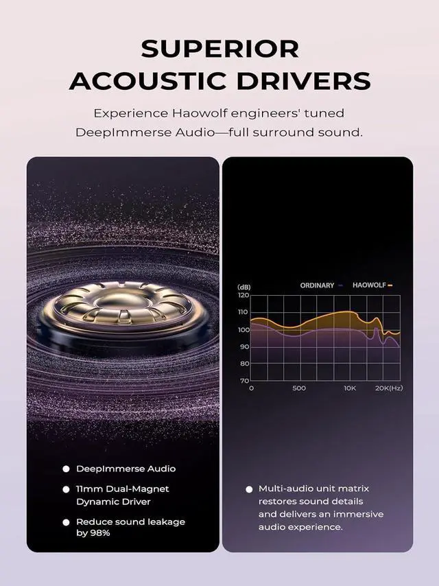 Powerful Stereo Sound & 4-Mic Clear CallsThe EP10 Bone Conduction Earbuds is equipped with Haowolfs independently developed 11mm precision Hi-Fi driver unit and bass enhancement technology, which enhances clarity and depth, improving sound quality by up to 5 times. It delivers rich, immersive audio, allowing you to clearly distinguish subtle details in music. With up to 4 built-in microphones featuring AI noise-canceling algorithms, it captures your voice and filters out interference, providing clear and smooth experiences for calls, meetings, and chats