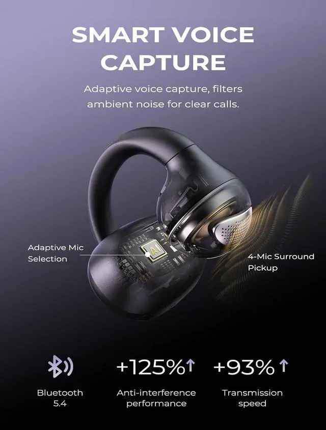 Open Ear Design & Bluetooth 5.4F eaturing an open-ear design, it lets you enjoy clear, immersive audio while fully perceiving your surrounding environment. Unlike traditional in-ear designs, these bone conduction headphones adopt directional acoustic technology, reducing sound leakage by up to 99% and keeping your ears open to ambient sounds. Equipped with the latest Bluetooth 5.4 technology, the EP10 offers faster transmission speed and stable connectivity up to 33 feet (approximately 10 meters), bringing great safety and convenience to driving, sports, or running
