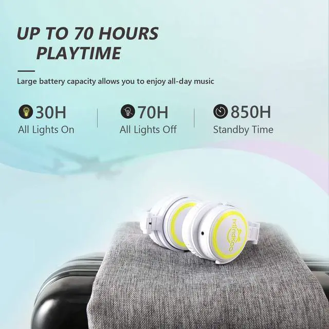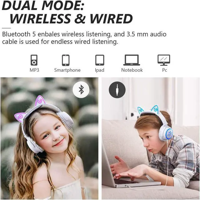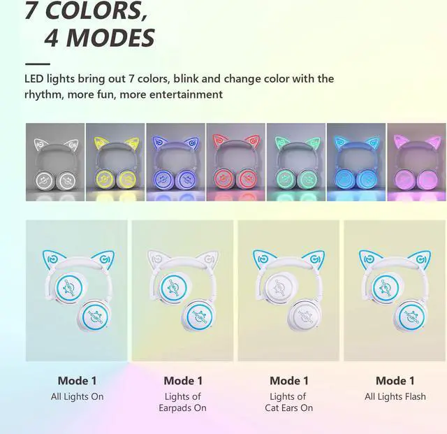 Cute Cat Ear & Shining LED Lights: The cute NEKO/Kitty Bluetooth headphones for kids feature 7 light colors with 4 modes (all on, ear-only, cup-only & all flashing). A holiday design is perfect for family gathering, party, children' s festivals, Christmas, Halloween, Thanksgiving Day, New Year etc.