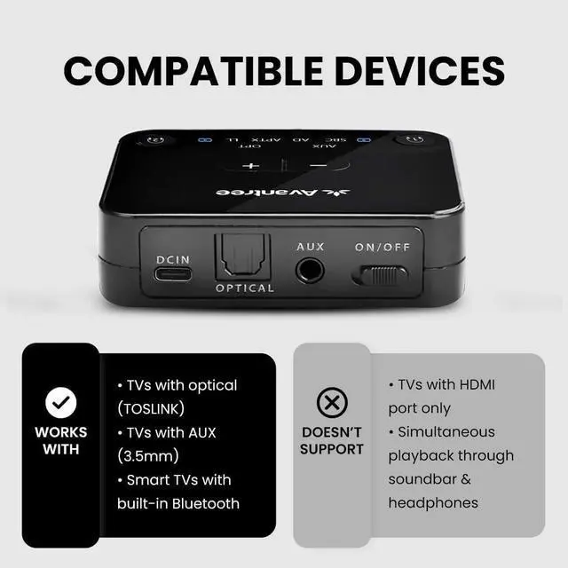 Universal TV CompatibilityWorks with any TV using Optical or AUX. Also supports Bluetooth pairing with smart TVs like Samsung and LG.