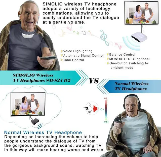 SINGLE DIGITAL WIRELESS TV HEADPHONES - Voice highlighting & noise reduction reduce TV background sounds and make dialogues stand out. Auto signal control makes the output stable, which avoids the hurt caused by a sudden increase in TV volume.
