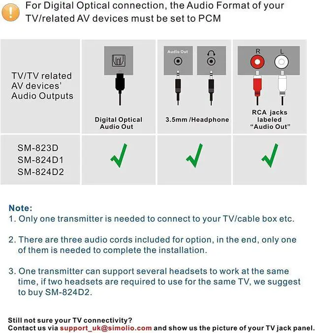 TV HEADPHONES AND SOUNDBAR AT THE SAME TIME: The by-pass allows TV headset to work TOGETHER with your existing soundbar or stereo AV Receiver to share the same optical audio output port on your TV. You will be able to hear the TV at your own volume through the headphones while the others can hear directly through the sound bar & speaker system. This feature is only available for optical connection.