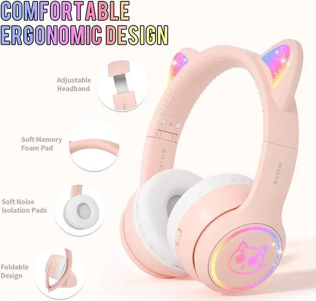 IFECCO Wireless Kids Headphones with Microphone,Foldable Cute Light Up Cat Ear Children Girls Bluetooth Headphones with Case for School Gifts Travel