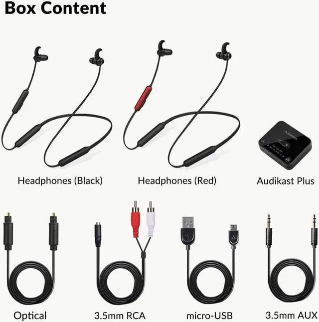[Simultaneous Audio and No Hassle Setup] The set uses the Audikast Plus Bluetooth transmitter, supporting Dual Link technology. Dual Link allows both headphones to receive audio at the same time. Because the headphones are factory pre-paired, the setup is a snap. Once you power on the transmitter and headphones, theyll connect right away