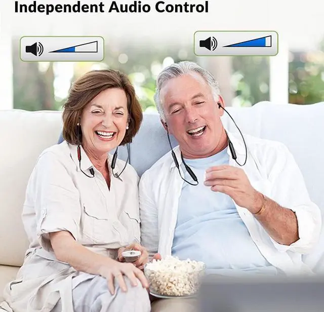 [Individual Volume Control, Long Playtimes] The in-ear headphones allow each user to adjust its own volume independently. Individuals experiencing hearing can turn up their volume and not disturb their partner or friend watching TV. When fully charged, provides up to 20 hours of playtime, longer than most competitors in-ear models