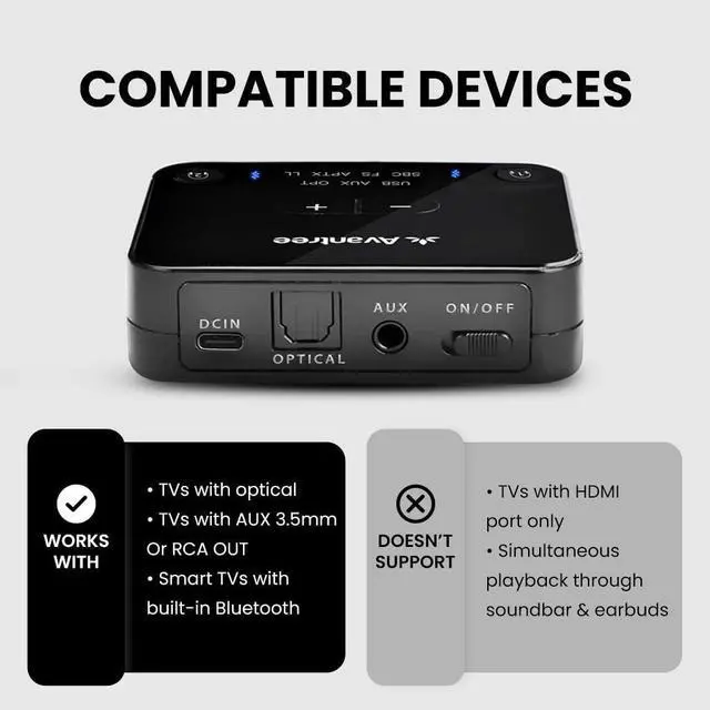 [TV COMPATIBILITY] The Avantree HT41866 is compatible with TVs with optical (TOSLINK), RCA, AUX ( 3.5 mm), or built-in Bluetooth audio outputs. Please confirm your TV is compatible before purchasing