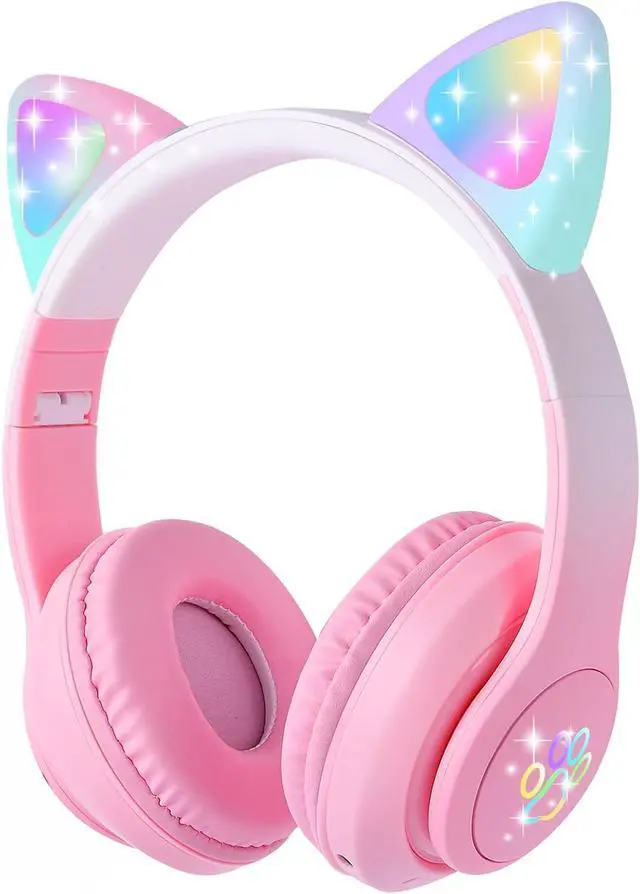 Lovely Girls Headphones with LED Cat EarThis kids bluetooth headphone is designed with cute cat ear and RGB LED lights, LED cat ears will dance and flash with the rhythm of the music, cute and stylish girls headphones are the perfect gift choice for kids. You can also press the " +" button twice to turn off the light and extend the use time.