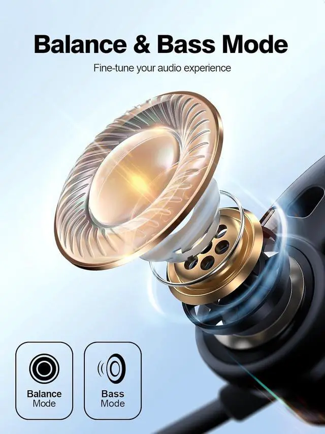 One-Press Dual EQ: Switch between 2 Music Modes effortlesslyBalanced Mode for clear, all-range audio (great for podcasts, audiobooks, or daily commutes) and Bass Mode for powerful, punchy low-end. It fuels your performance perfectly for fitness, gaming, or vibing to your favorite tracks