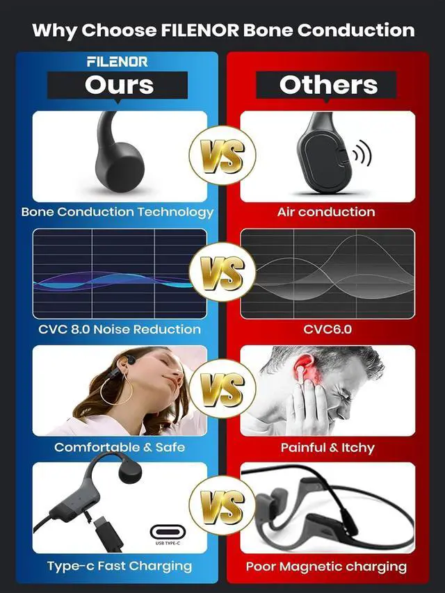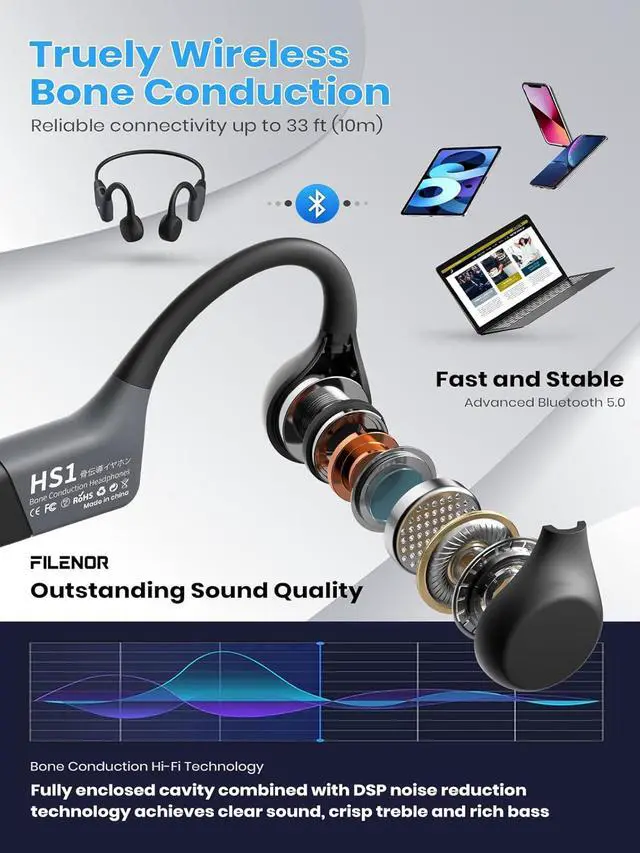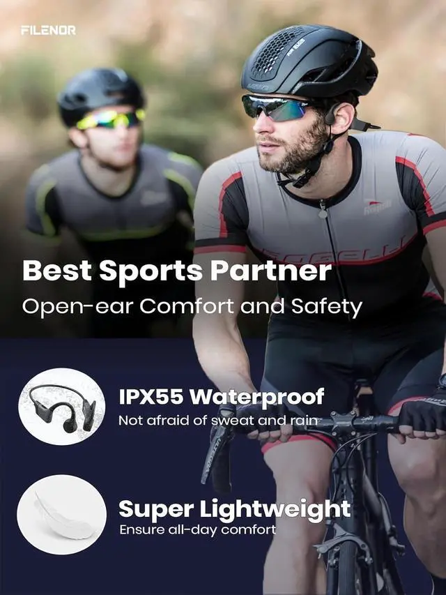 Next-Level Bone Conduction TechnologyFilenor advanced bone conduction technology brings you unbeatable quality audio through your cheekbones, making it possible to fully enjoy your music while still being aware of your surroundings. With improved technology and a fully enclosed cavity, Filenor bone conduction headphones reduce sound leakage by up to 50%, providing an unparalleled audio experience.