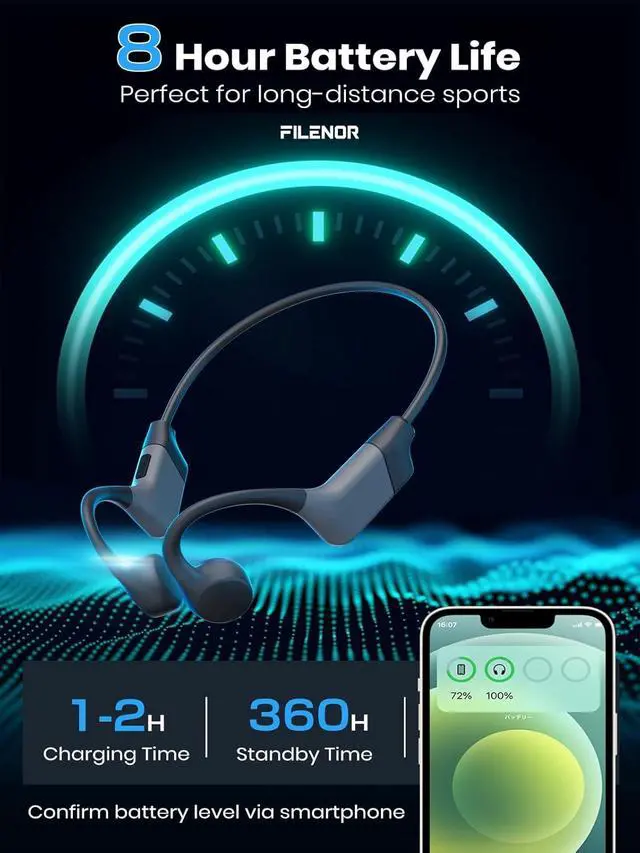8-Hour Battery Life & Type-C Fast ChargeEnjoy up to 8 hours of music or calls without interruption. The wireless headphones support Type-C fast charging, which is safe and stable, and also come with a 10-minute quick charge feature that gives you 1.5 hours of battery life. Save time and hassle with Filenor open ear headphones.