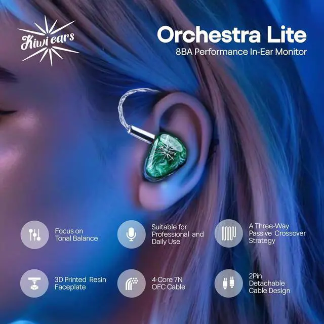 , -The Kiwi Ears Orchestra Lite was built on the same foundation as the original Orchestra, yet redesigned to be more efficient, both in performance and cost. The Orchestra Lite features the same 8 balanced armature driver configurations and the famed tonal balance as its predecessor including two custom ultra tweeters for the treble, four custom mid-range balanced armature drivers for the mids, and two subwoofer drivers for the lows.