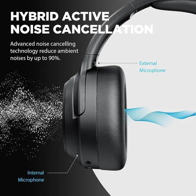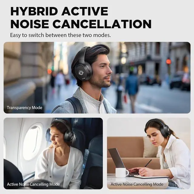 HYBRID ACTIVE NOISE CANCELLATION TECHNOLOGY: This Active Noise Cancelling headpohones Wireless reduce ambient noises by Up to 90% so you can immerse yourself in music whether it' s the roar of airplane engines, subway rumble, or office chatter. Transparency mode lets you hear and interact with the world around you. It is still important to be aware of your suroundings, especially when walking or cycling outdoors.