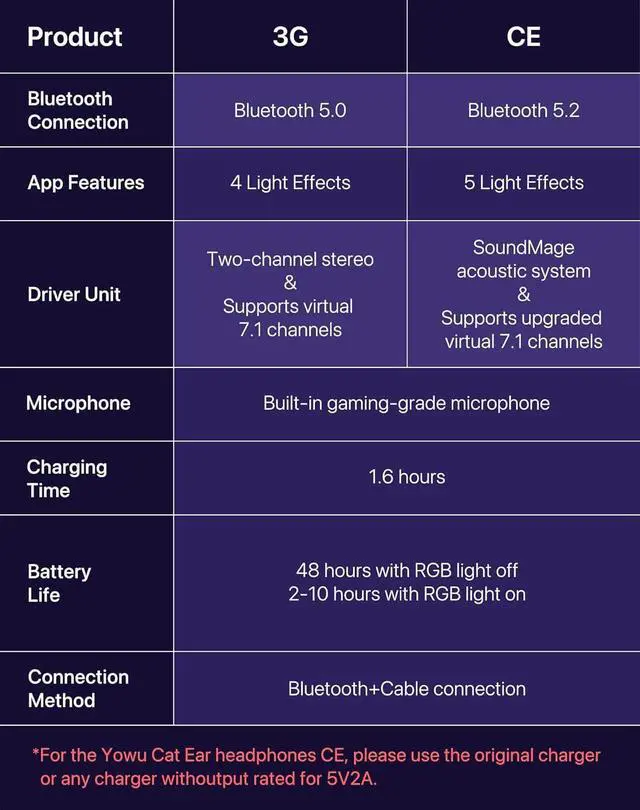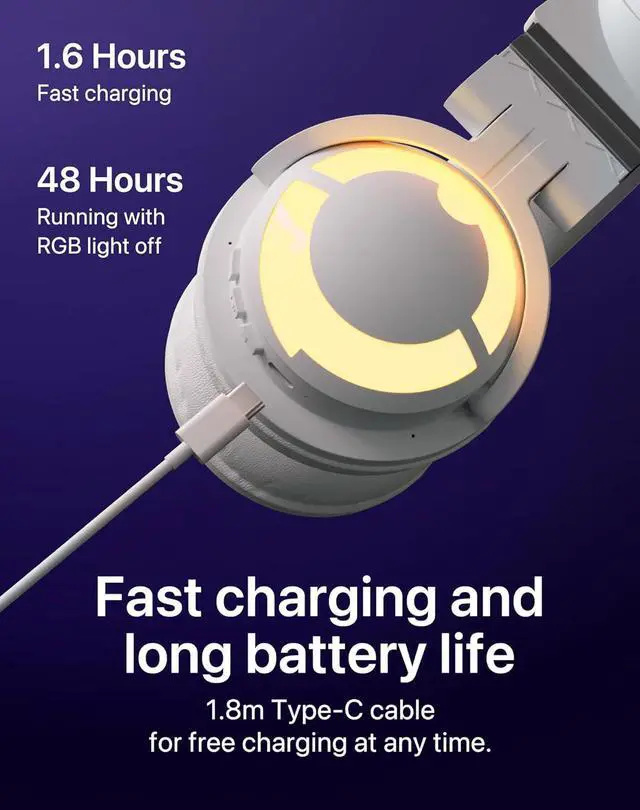 Longer Battery Endurance - Latest battery upgrade, 1.6 hour fast charging with upgraded charging power. 48 hours playing time without lighting, or 2-10 hours playing time with lighting. *For the Yowu Cat Ear headphones 4, please use the original charger or any charger with an output rated for 5V2A to prevent any product damage caused by incompatibility*