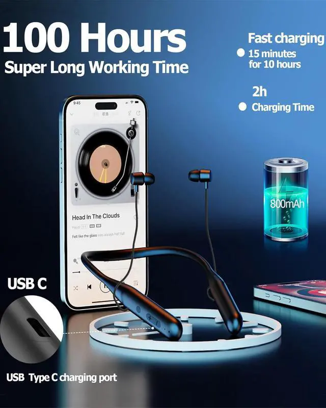 Battery Life]: The high performance 800mAh rechargeable battery in this neck headset can provide up to 100 hours of talk or music playtime per each full charge. Just need to charge it 1 or 2 times a month in average use. The USB-C (Type-C)charging port is very convenient to use. Fast charging is supportted, quick charge 15 minutes can work about 10 hours.