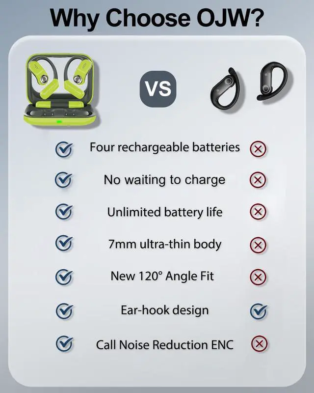 Open-Ear Design for Comfortable to All-Day Wear - Ultra-light 0.3 oz with flexible titanium core adapt to any ear shape. Robust yet comfortable, it offers seamless, all-day wear. Open-Ear Awareness Stay connected to your surroundings with OJW open-ear design, ensuring the safety and comfort of use and prolonged wear.