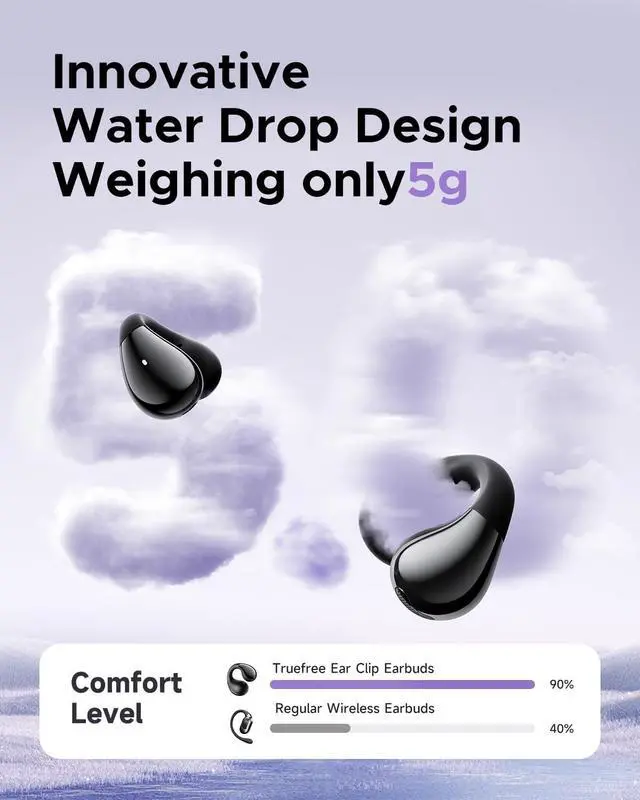[Open-Ear Design with Secure Fit] - The Truefree B1 wireless earbuds feature an innovative open-ear clip-on design that rests outside your ear canal, offering breathable, pressure-free comfort. Crafted with skin-friendly liquid silicone hooks and weighing just 5g per earbud, they provide a secure, slip-resistant fit ideal for all-day wear.