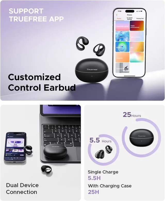 [Custom Sound with the Truefree App] - Take full control of your listening experience. Use the Truefree App to adjust EQ presets, customize touch controls (including volume), and reset your earbuds with ease through an intuitive interface.