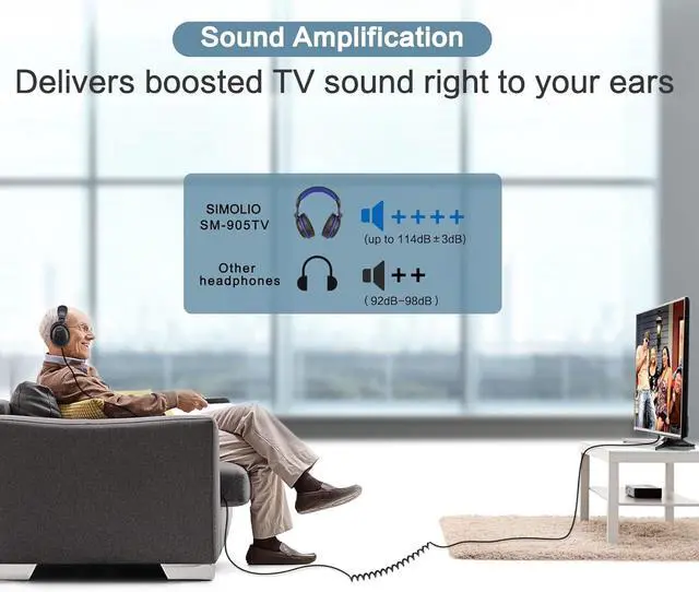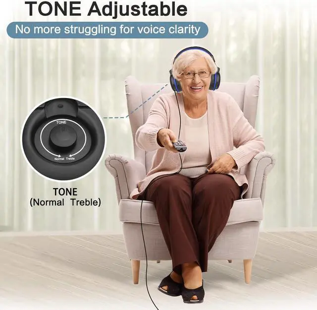 VOICE CLEAR & ENHANCED: Sound amplified TV headphones overcome the muffled low volume issue with most regular long corded headphones, bringing powerfully boosted audio right to your ears. Adjustable TONE feature makes dialogue better clarified. No need to rely on turning up volume to hear voice clearly. Ideal for normal hearing as well as aging ears requiring voice clarity.
