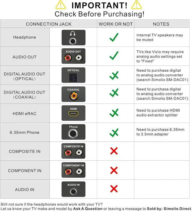 WIDE COMPATABILITY: Can work with any 3.5 AUX & RCA audio OUTPUT ported device. RCA converter cable included. TVs with only digital optical or coaxial audio output REQUIRE a separate digital to analog converter. Search SIMOLIO SM-905TV & DAC Bundle to know more details.