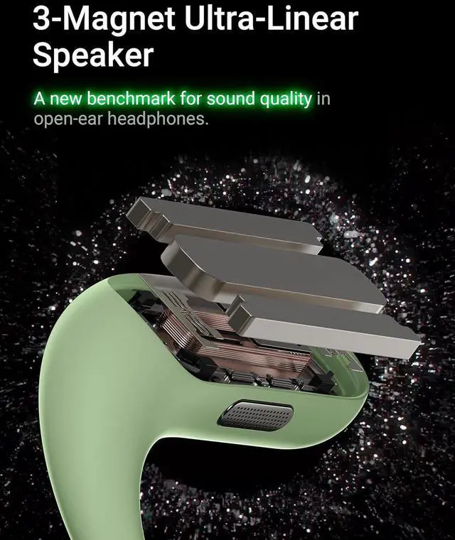 Redefining Open-Ear Audio: Engineered by Luxshare-ICT, the 3-magnet super-linear speaker redefines open-ear audio. With up to 0.5 mm high amplitude and cutting-edge diaphragm technology, it delivers powerful, deep bass, crystal-clear highs, and a rich, immersive sound experience.