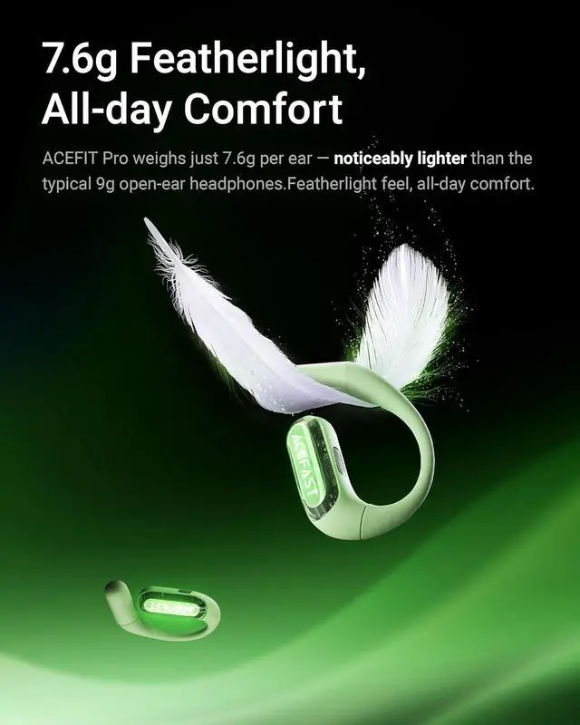 Ultra-Comfort All-Day Wear: Weighing just 7.8 g, AceFit Pro is coated with ultra-soft supramolecular liquid silicone for a gentle, secure fit. The ultra-thin 0.7 mm nickel-titanium memory wire ear hooks adapt perfectly to any ear shapeeven for glasses wearersredefining minimalist comfort.