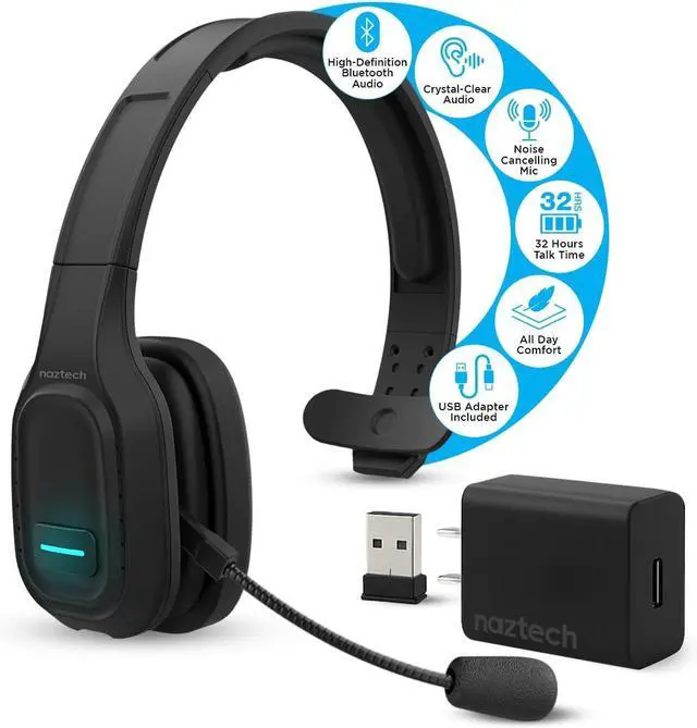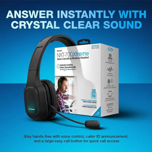 IMMERSIVE HD SOUND WITH NOISEHUSH TECHNOLOGY: Enjoy superior audio with the Naztech NXT-700 bluetooth headset with mic. This truck driver headset uses 96% noise cancellation to block distractions. It' s ideal as a wireless headset for work, trucker bluetooth headset noise canceling, or hands free headset for cell phone. Whether youre using a trucking headset bluetooth on the highway or in a warehouse, it keeps communication clear. It' s compatible with truckers headsets wireless bluetooth setups.