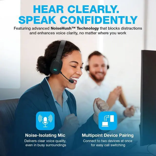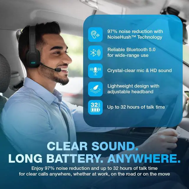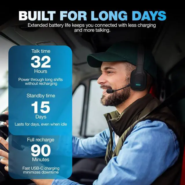 HOURS TALK TIME: Stay connected longer with this wireless phone headset, offering up to 32 hours of talk time and 550 hours standby. Ideal for long shifts, it' s a reliable wireless work headset with mic for remote work. Use it as bluetooth headphones for truck drivers, a dependable truck headset bluetooth, or a daily bluetooth headset for work companion. It also fits well into any bluetooth trucker headset with mic setup or for cell phone headset.