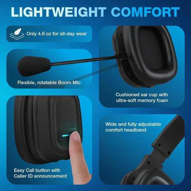 ROTATABLE MICROPHONE FOR CLEAR COMMUNICATION: Designed for precision voice pickup, this trucking headset bluetooth features a rotatable boom mic for flexible use. Whether you' re in customer support or logistics, it works great as a wireless call center headset, trucker headphones, or phone headset bluetooth wireless. Compatible with numerous bluetooth devices, this trucker headset noise cancelling is ideal for travel communication and ensures clear calls while on the go.