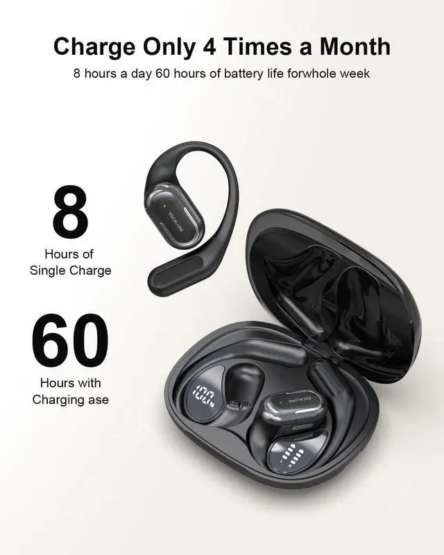 60 Hours Total Battery Life Charge just 4 times a month! These open ear headphones deliver 8hrs of non-stop music per charge, with the charging case extending that to 60hrsenough to power through your entire workweek. The dual LED displays show precise battery levels for both the case and the open ear earbuds at a glance.