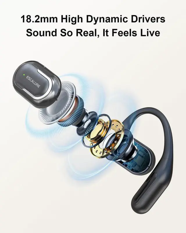 Concert Hall Sound & Voice Clarity ESCALURE open ear headphones with 18.2 mm giant drivers pump out stadium-quality audio with our OpenBass 2.0 techfeel the bass punch through your bones while catching every vocal nuance. 4 mics team up with AI to erase background noise, making your subway calls sound like youre in a private jet. Experience superior sound with these open ear earbuds for a concert-like listening experience.