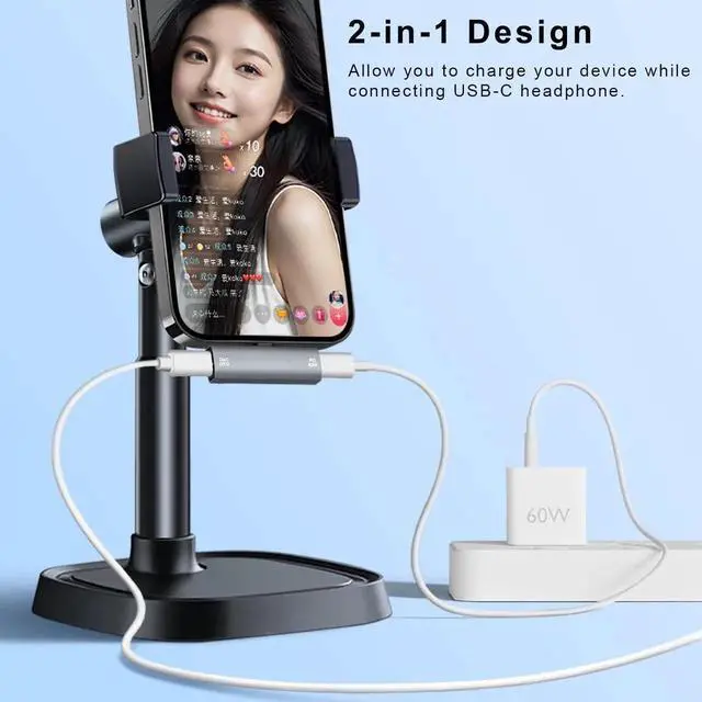 Dual USB C Headphone and Charger Adapter, 2-in-1 USB Type C Audio Jack with PD 60W Fast Charging Splitter Dongle for iPhone 15/16 Series, iPad, Galaxy, Note, Pixel and More