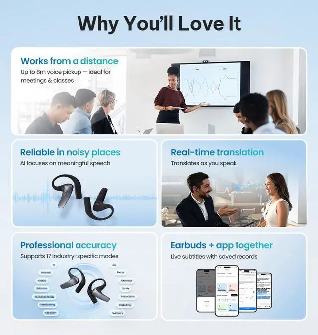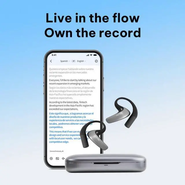 No More "Lost in Translation" at LiveEvents. In a loud hall with professional speakers, catching everydetail is hard. Our Al modes handle the tough words andnoisy rooms for you. Just put them on and follow thespeech effortlessly, start to finish.