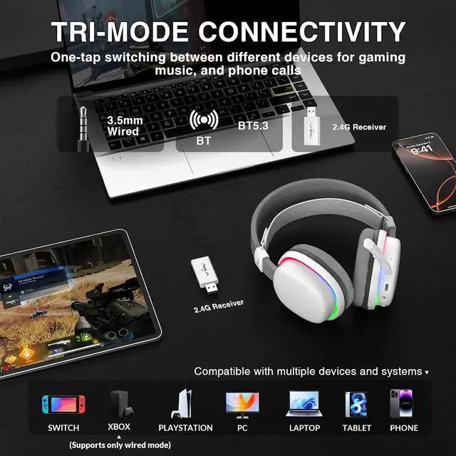 Wireless Tri-Mode Connection: This wireless gaming headset supports three connection methods: 2.4G/Type-C wireless, BT 5.3, and 3.5mm wired. In 2.4G mode, latency drops to just 10ms. Switch instantly to BT for calls during gameplay, mute the mic with a single button presseffortless blind operation for gaming, commuting, online classes, and more. Compatible with multiple devices including PC, PS5/PS4, Switch, and smartphones.Note: Only the 3.5mm wired mode supports Xbox Series X/S/One