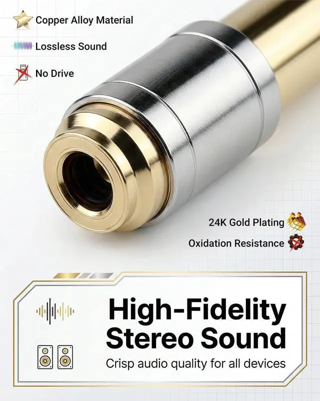 [24K Gold-Plated]: Features premium gold-plated connectors to ensure lossless signal transmission and corrosion resistance. Enjoy crisp high-fidelity stereo sound without static.