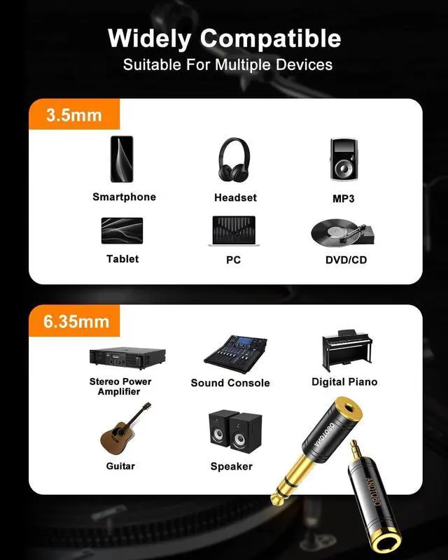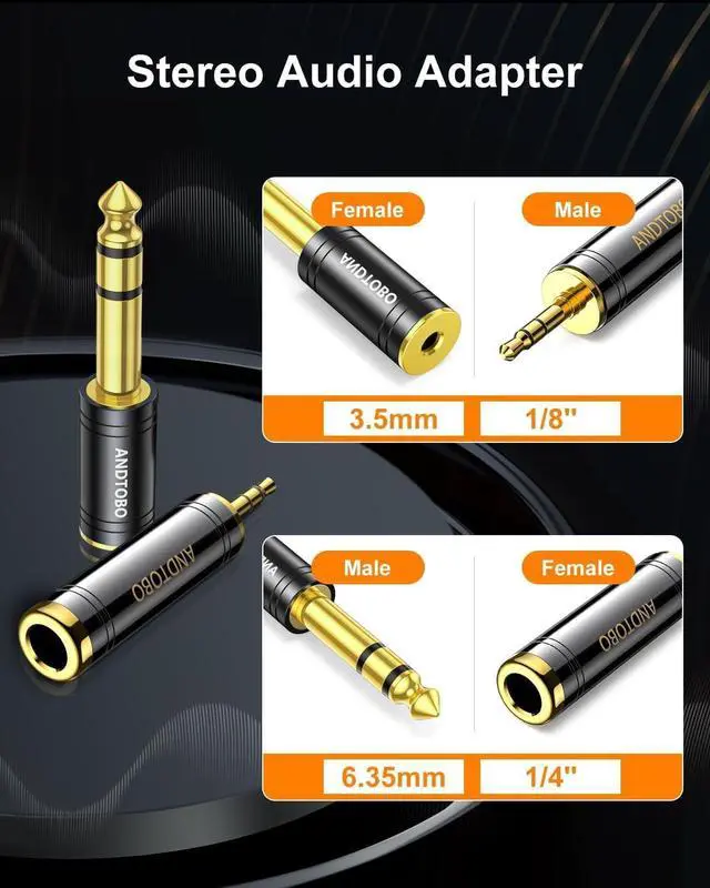 1/8 to 1/4 adapter Work for for 3.5 mm jack equipment connect 3.5 mm Male to 6.35 mm Female allows you connect headphones to audio devices guitar microphone etc. 1/4 inch to 1/8 inch adapter work for 6.35 mm jack equipment connect 6.35 mm Male to 3.5 mm Female allows you connect audio devices to headphones. Made of pure copper and it's service life is much longer than plastic and gold plating. Pure copper connectors resist corrosion and ensure minimal signal loss. Handy and portable widely work with earphone headphone karaoke system etc. 100% Lifetime warranty and friend customer service.