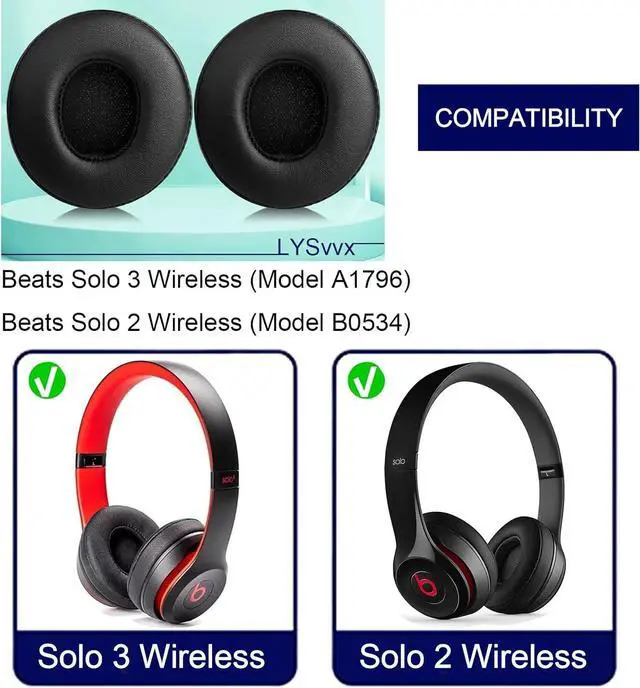 ?? COMPATIBILITY - LYSvvx ear pads are designed to fit Beats Solo2 and Solo3 Wireless headphones (Model B0534 and Model A1796). Please verify your headphones' model before buying!?? Solo 3 earpads - Made from high-quality professional-grade protein leather LYSvvx replacement ear pads are durable and crack-resistant for long-lasting use.?? ENHANCED COMFORT - LYSvvx ear pads are equipped with Extra Thick & Slow-Rebound memory foam that conforms to your ears for a personalized fit delivering great bass and ultimate comfort.?? EASY INSTALLATION - The LYSvvx package includes 2 ear pads and 1 Plastic stick making the 3-step installation process simple.