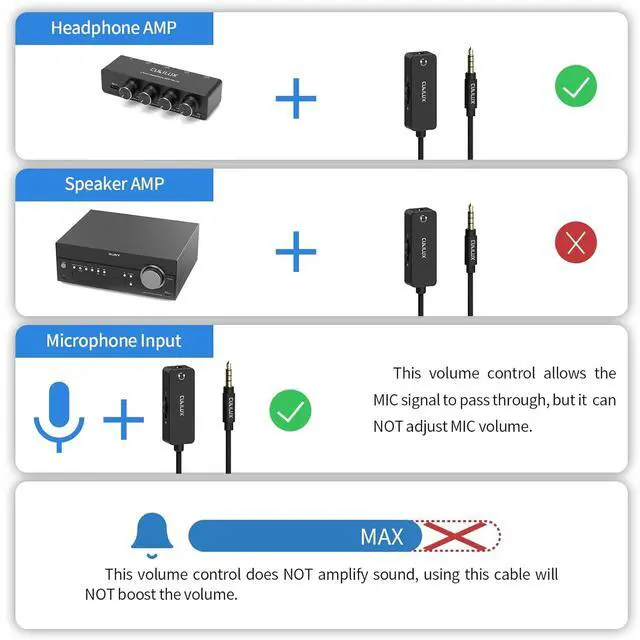 [NOT for Amplifying Sound] C This volume control does NOT amplify sound using this cable will NOT boost the volume. [NOT for Control Microphone Volume] C This volume control allows the microphone signal to come through but it is for adjusting the volume of the audio output signal ONLY NOT for adjusting MIC volume.