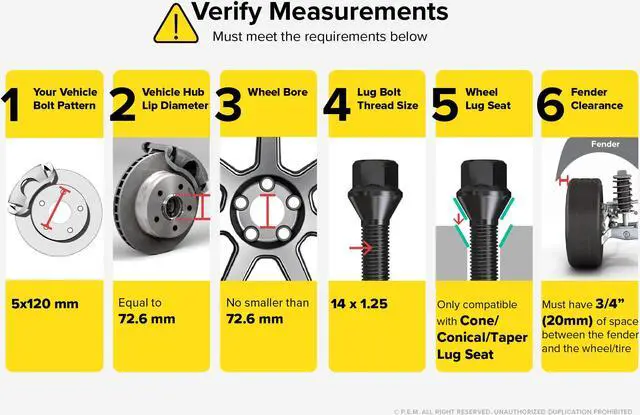 - [VERIFY FITMENT] Spacers only fit vehicles with 5/120 bolt pattern, 72.6mm Centerbore, and use 14x1.25 wheel bolts. Even if a vehicle is listed as being compatible, buyers still need to check: 1) Your wheels accept Cone Seat bolts; 2) You have 3/4" (20mm) of space between your fender and your wheel/tire; 3) Wheel bore needs to be no smaller than 72.6mm.