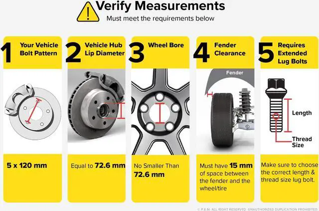- [VERIFY FITMENT] Even if a vehicle is listed as compatible, buyers still need to check: 1) You have 15mm of space between your fender and your wheel/tire; 2) Your studs/bolts are the correct length to ensure safe nut/bolt thread engagement; 3) For proper installation you may need aftermarket Extended Lug Bolts or Extended Wheel Studs (NOTE: NOT INCLUDED with this listing); 4) Wheel bore needs to be no smaller than 72.6mm.