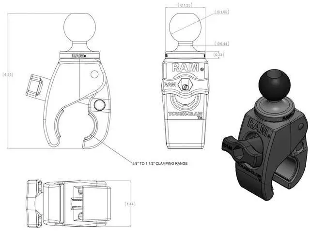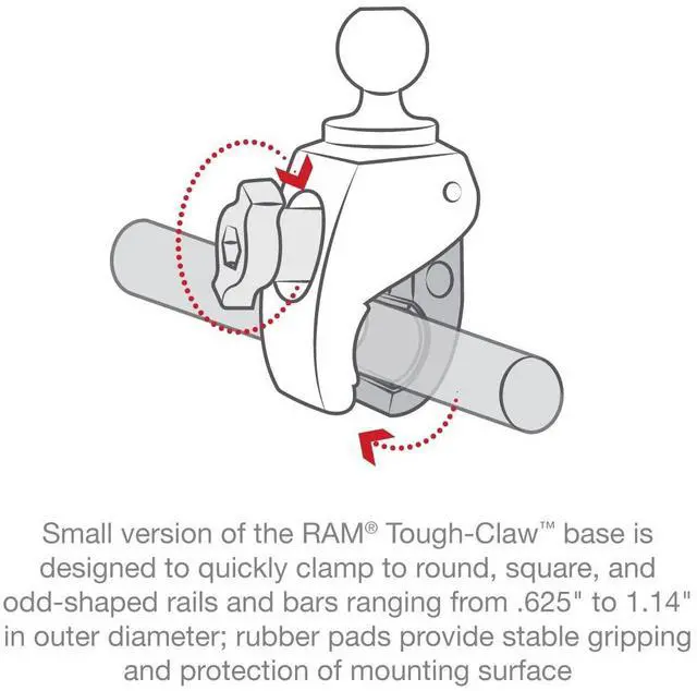 The RAM Tough-Claw is the perfect mounting base for toolless installation and removal on round, square, and odd-shaped rails and bars. The small version of the RAM Tough-Claw can quickly be clamped on rails ranging from .625" to 1.14" in outer diameter and is ideal for mounting phones, tablets, action cameras, rod holders, and much more in a wide variety of applications. Perfectly suited for mounting on the yoke of an aircraft, handlebars of bicycles and motorcycles, or even on kayak rails and roll bars, the RAM Tough-Claw will soon become another essential RAM component in your collection.