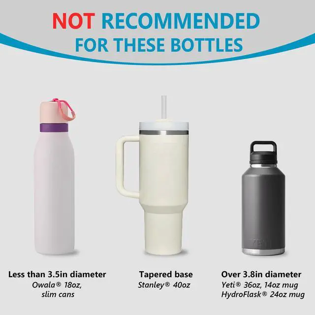 | Does it work with my bottle? | It fits bigger bottles in 3.4"-3.8" diameter. If your cup has a boot, you'll need to consider the diameter with the boot on. |