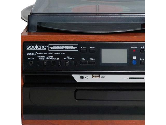 Random Play, Programmable Memory, Multi-function Back-lit LCD Display, Direct USB/SD recording from Turntable / Cassette / CD / AUX IN / AM/FM Radio. 1-year warranty from Boytone USA. Mahogany wood color